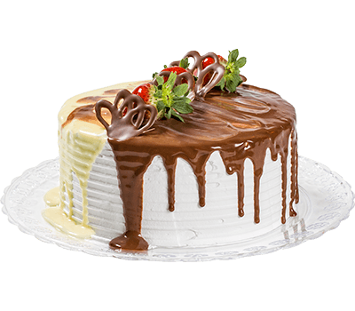 Massa branca húmida, um recheio de creme de leite em pó com pedaços de chocolate branco e outro de ganache de chocolate preto, coberto com chantilly, ganache branca e preta e morangos ou cerejas.