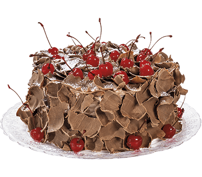 Massa escura húmida, dois recheios de chantilly branco com cereja em pedaços, coberto com chantilly, raspas de chocolate e cerejas.